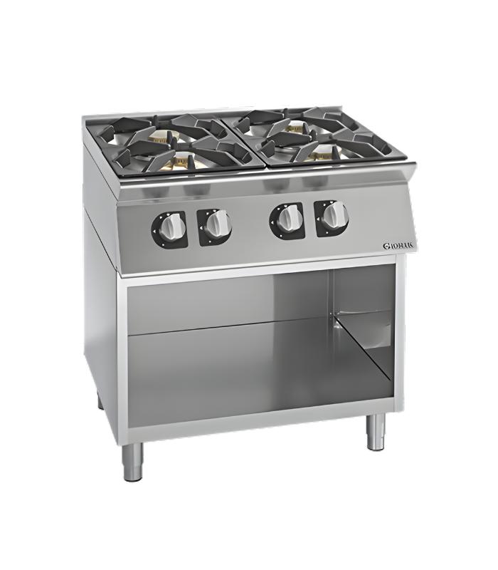 El modelo tiene una anchura de 800 mm, profundidad de 700 mm y altura total de 900 mm, con una superficie de trabajo ajustable entre 855 mm y 900 mm gracias a sus patas de acero inoxidable regulables. La base es abierta, ideal para almacenamiento de utensilios o insumos. Funciona con gas natural, conexión de ¾”, con una potencia total de 24 kW, compuesta por dos quemadores de 4 kW y dos de 8 kW para proporcionar un rendimiento equilibrado.
