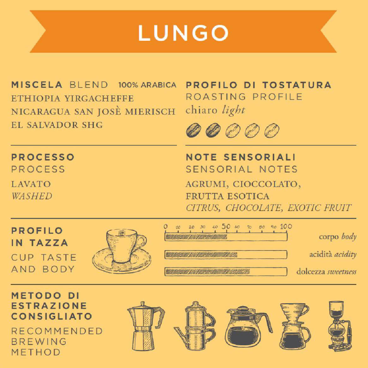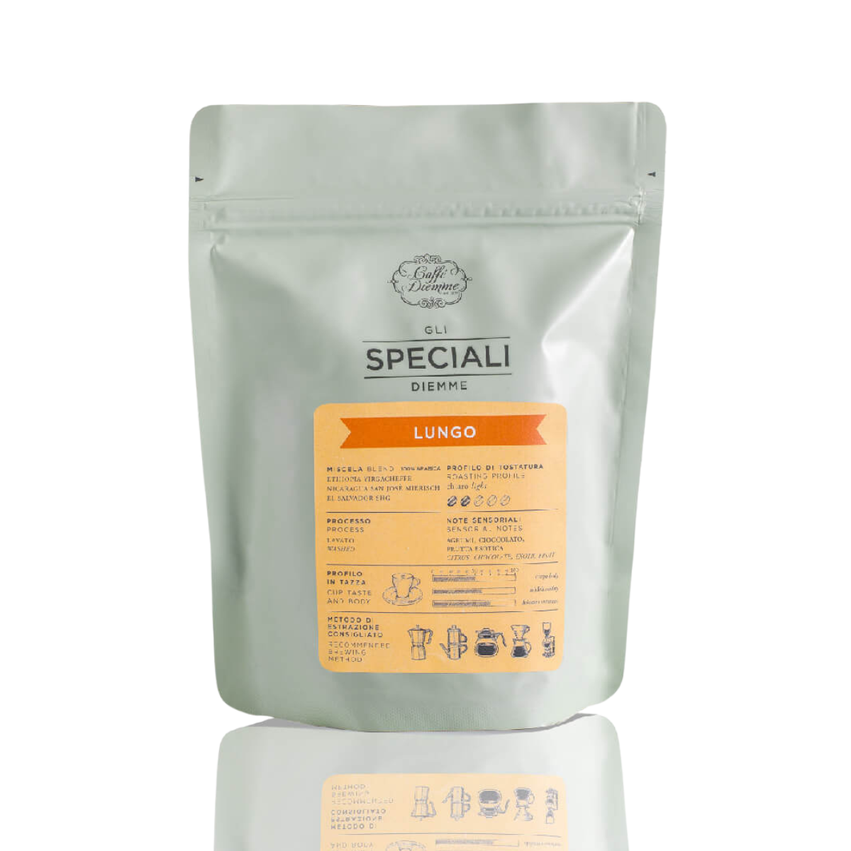 Granos de café de origen único de la línea “Gli Speciali”. Envasado en bolsa de 200g.